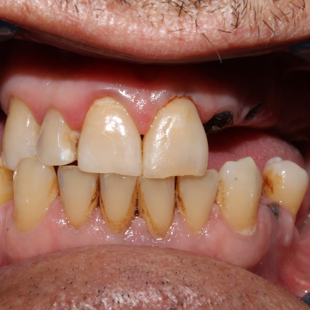 Dein Lächeln vorher: sichtbare Beläge, die dein Selbstbewusstsein und die Gesundheit deiner Zähne beeinträchtigen.