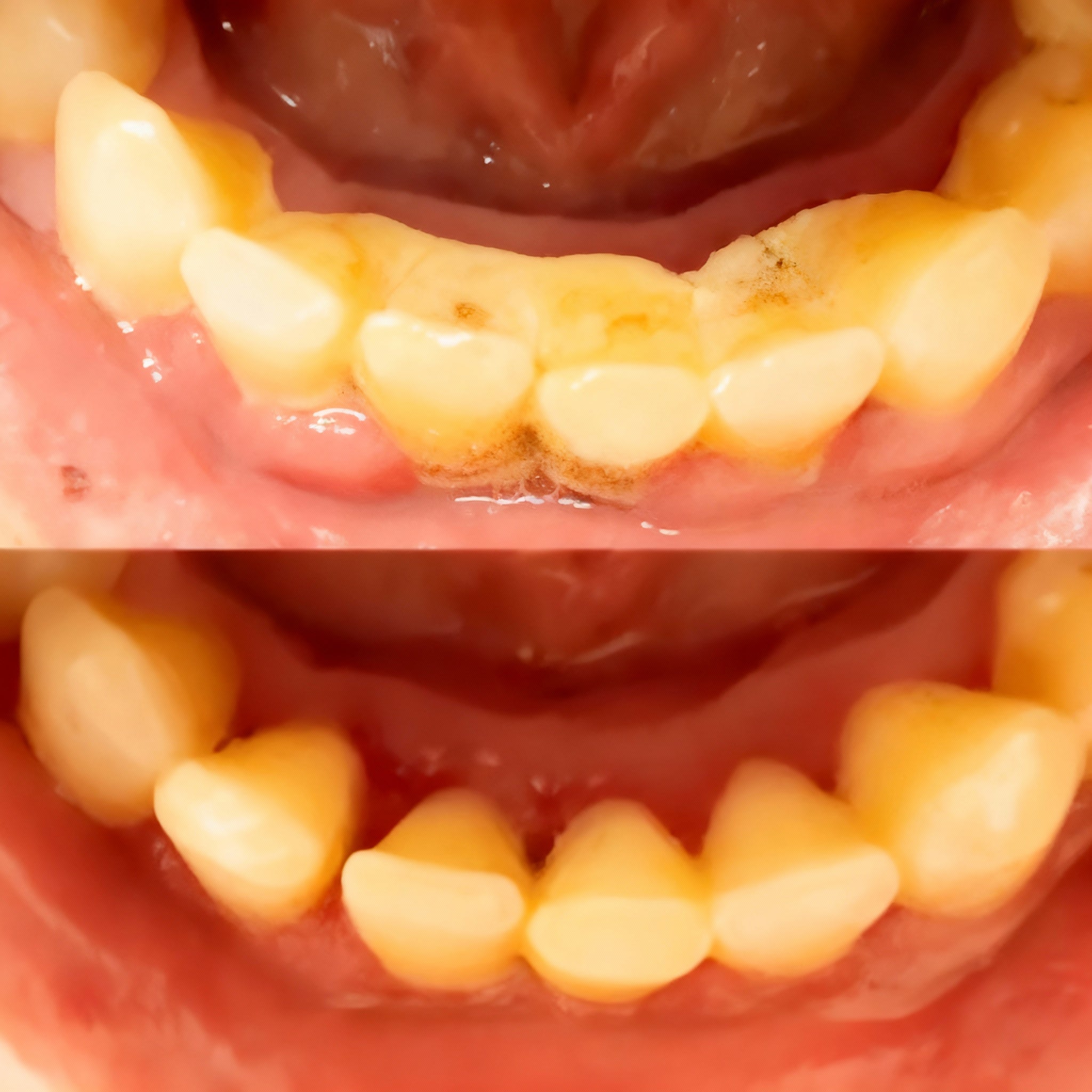 Selbst gründliches Putzen entfernt keine Zahnstein-Ablagerungen. Diese härten sich mit der Zeit aus und werden zu idealen Brutstätten für Bakterien – die Ursache für Verfärbungen, Mundgeruch und Zahnfleischprobleme.